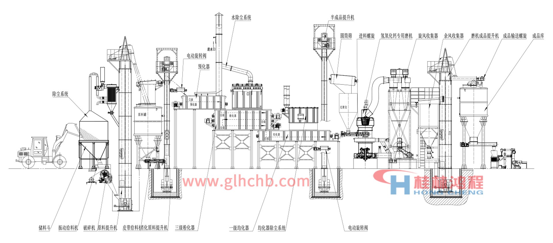 山東淄博灰鈣生產線桂林鴻程環保供應的配套設備包括那些?山東淄博灰鈣生產線整套設備包括石灰石進料斗、振動給料機、破碎機、原料提升機、皮帶給料機、消化原料提升機、三級粉化器、預化器、一級均化器、均化器除塵系統、水除塵系統、電動旋轉閥、半成品提升機、圓筒篩、進料螺旋、氫氧化鈣專用磨粉機(HC擺式磨粉機80-400目、HLMX超細立磨出粉325-3000目以上)、旋風收集器、余風收集器、磨粉機成品提升機、成品庫等。
