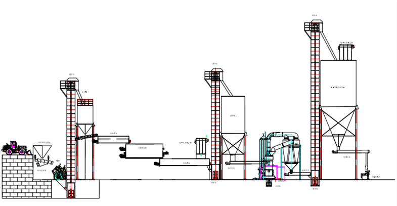 振動給料--》錘式破碎機破碎(脈沖除塵器)--》提升機--》原料罐--》給料皮帶--》預消化系統--》消化系統--》均化系統--》提升機--》圓筒篩(排渣)--...